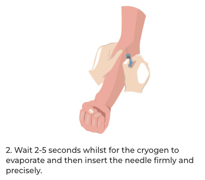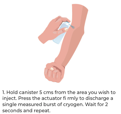 Cryoanalgesia is the therapeutic use of cold to provide temporary and reversible numbing of superfi cial sensory nerves in the skin. This product has been specifi cally designed to allow the User to deliver a carefully dosed burst of liquid cryogen at -50°C to the skin area prior to insertion of a needle. Suitable for paediatric clinics, primary care and GP surgeries, phlebotomy departments and minor op facilities. This unit is also suitable for use in dentistry for oral application to test nerve root perception to cold.