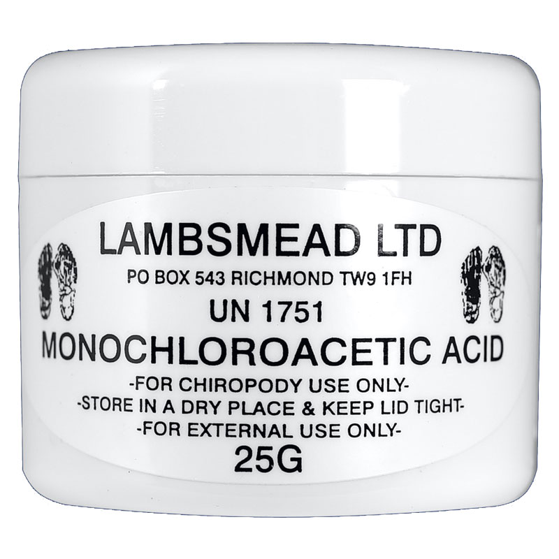 Monochloroacetic acid (MCA) 25g – a very strong keratolytic agent used as an acidic topical medicine by podiatrists and dermatologists for decades, which when applied to skin, softens keratin, helping loosen and assist exfoliation of skin cells whilst helping skin bind moisture. A powerful irritant which should be administered by experienced health-care professionals only – monochloroacetic acid is used as an effective alternative for successfully treating persistent cutaneous (common and plantar) warts when salicylic acid and cryotherapy treatments have failed. Also useful in treating dry-skin conditions such as psoriasis, acne, calluses, corns and other forms of keratosis, monochloroacetic acid is often combined with 70% salicylic acid to moderate action.